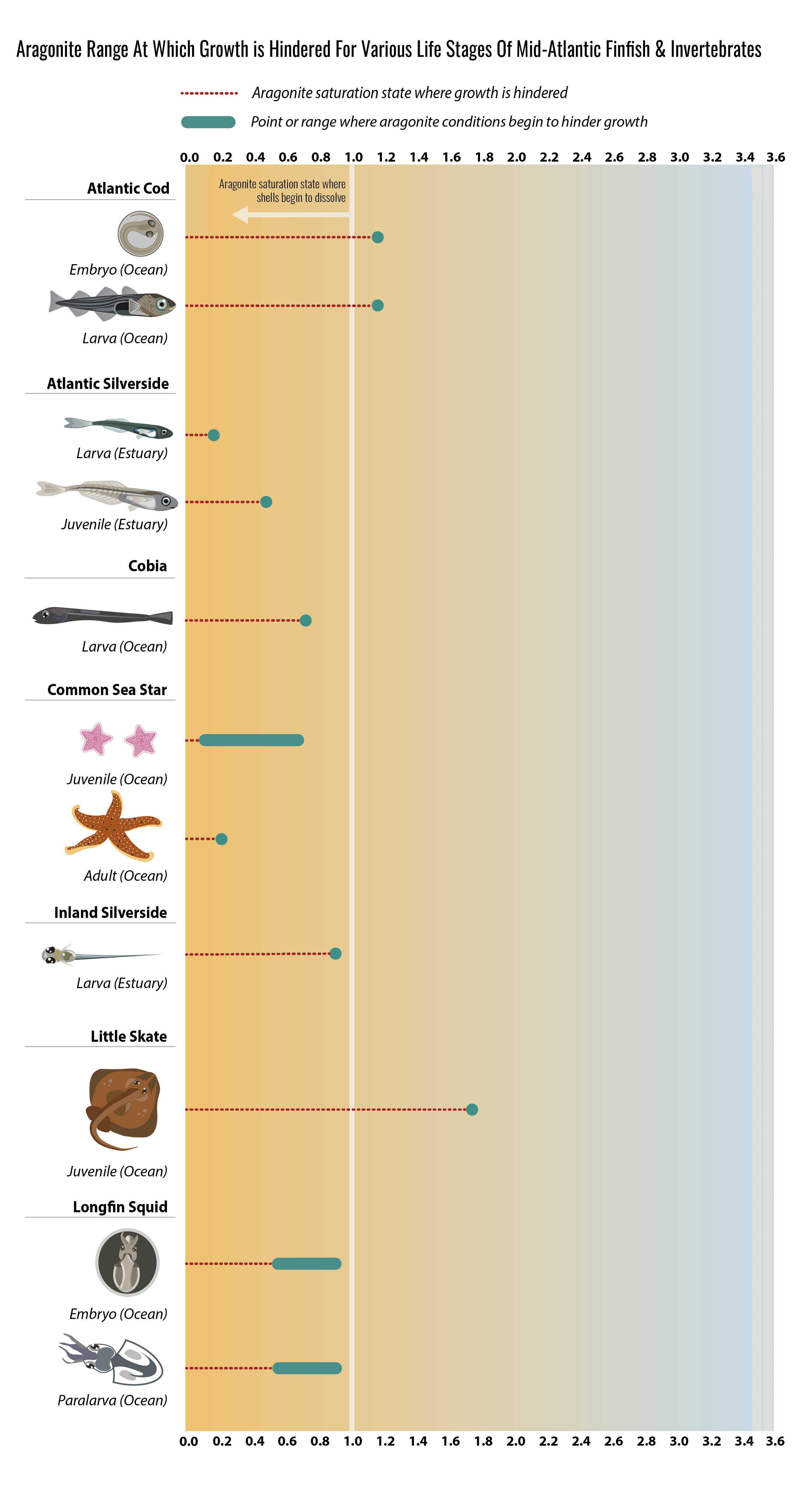 The red lines represent the conditions that are expected to cause high mortality rates or reduced growth for a given species. The blue and teal points or ranges show the experimental conditions that were proven to be harmful to organisms in laboratory studies. Some species have shown negative responses to low pH and/or aragonite saturation, such as reduced reproductive rates, reduced growth rates, and death. The range of conditions that caused biological impacts varies across species and did not always result in mortality. The red line indicates where adverse effects were lethal and caused mortality. There are also numerous studies that have found neutral or positive effects of acidification on certain species, although this graphic does not focus on them.