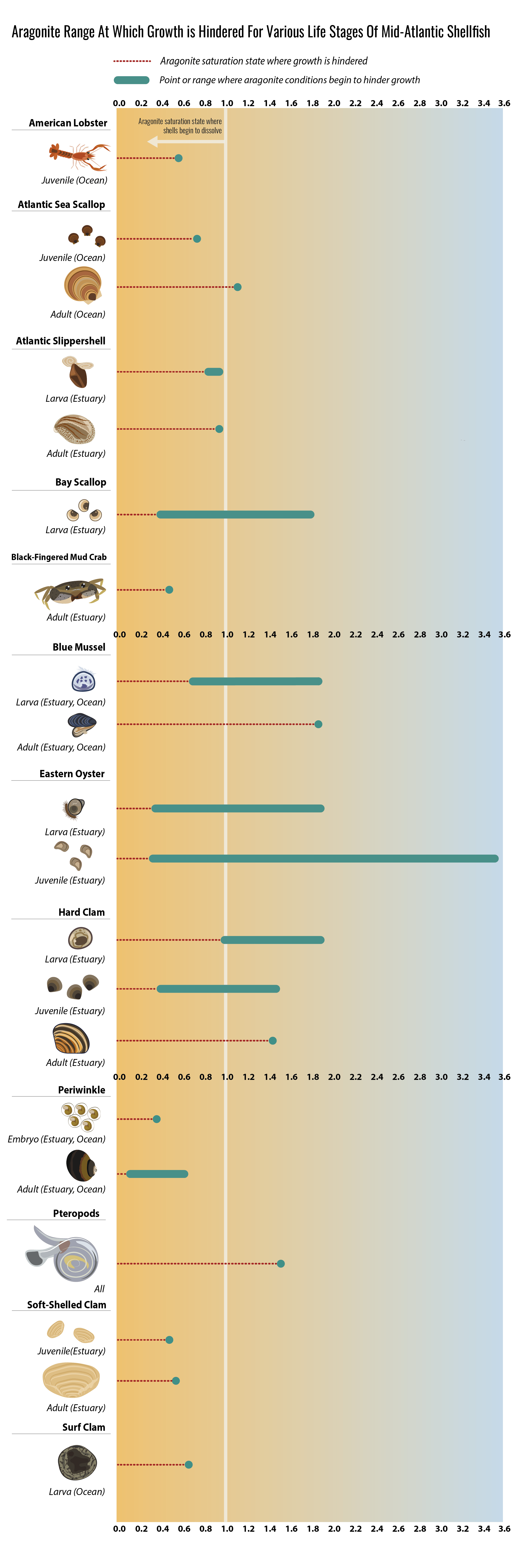 The aragonite saturation state reference line in the shellfish graphics represents a value of 1. At, or below this value, aragonite minerals in shells and skeletons may dissolve. Above this value is considered to be sufficient for most species to survive. Below a value of 3 is when stressful conditions for animals have been shown to begin to occur in some species.