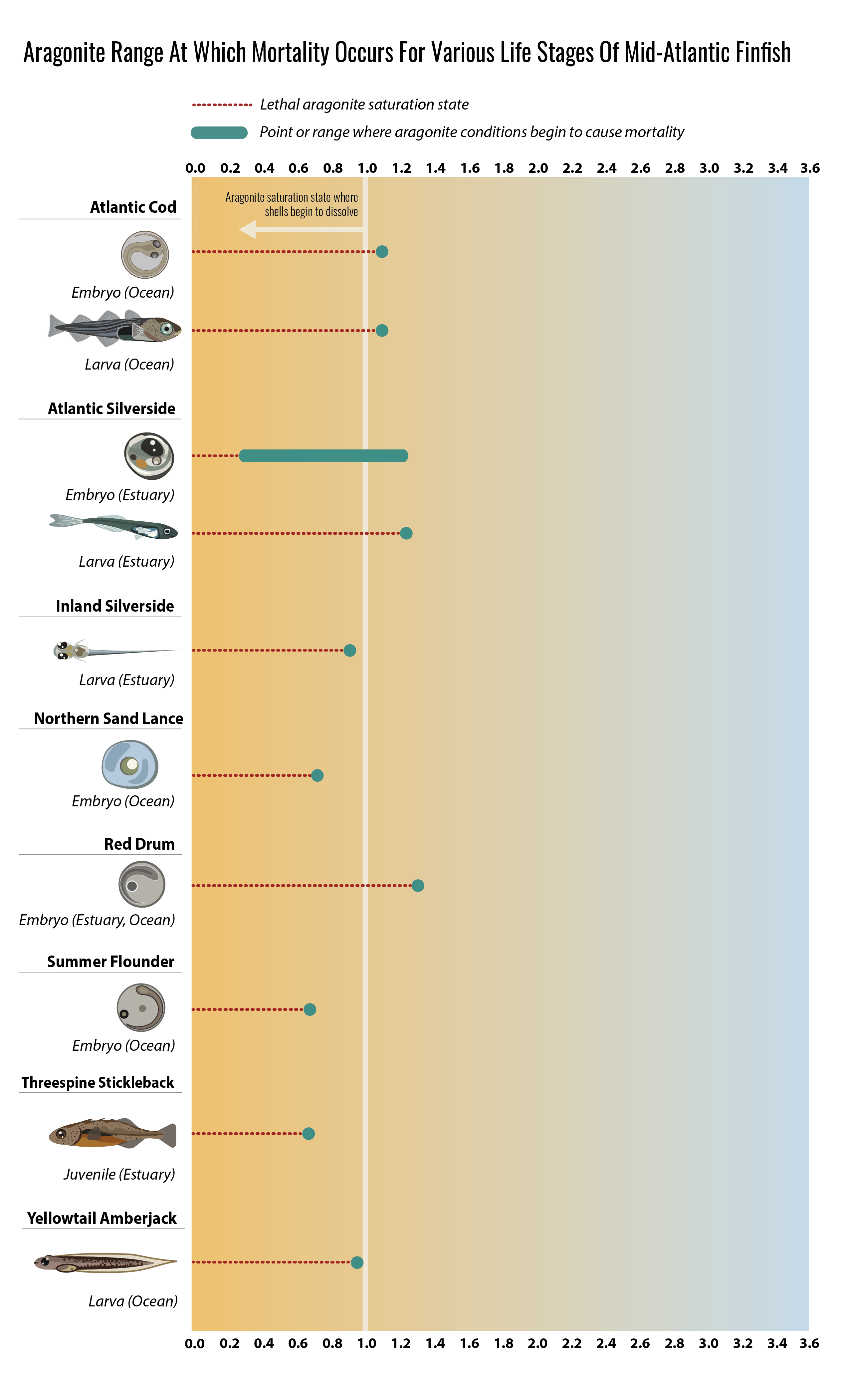 Use the graphics to locate a particular species. To determine where low pH or aragonite saturation state may impact a particular or multiple species, one needs to know what the environmental condition is in the habitat where the species is found. For example, American Lobster larval mortality may begin at a pH of 7.7, whereas juvenile mortality may begin at pH 7.8. Growth of the American Lobster can also be hindered by pH and/or aragonite saturation state.