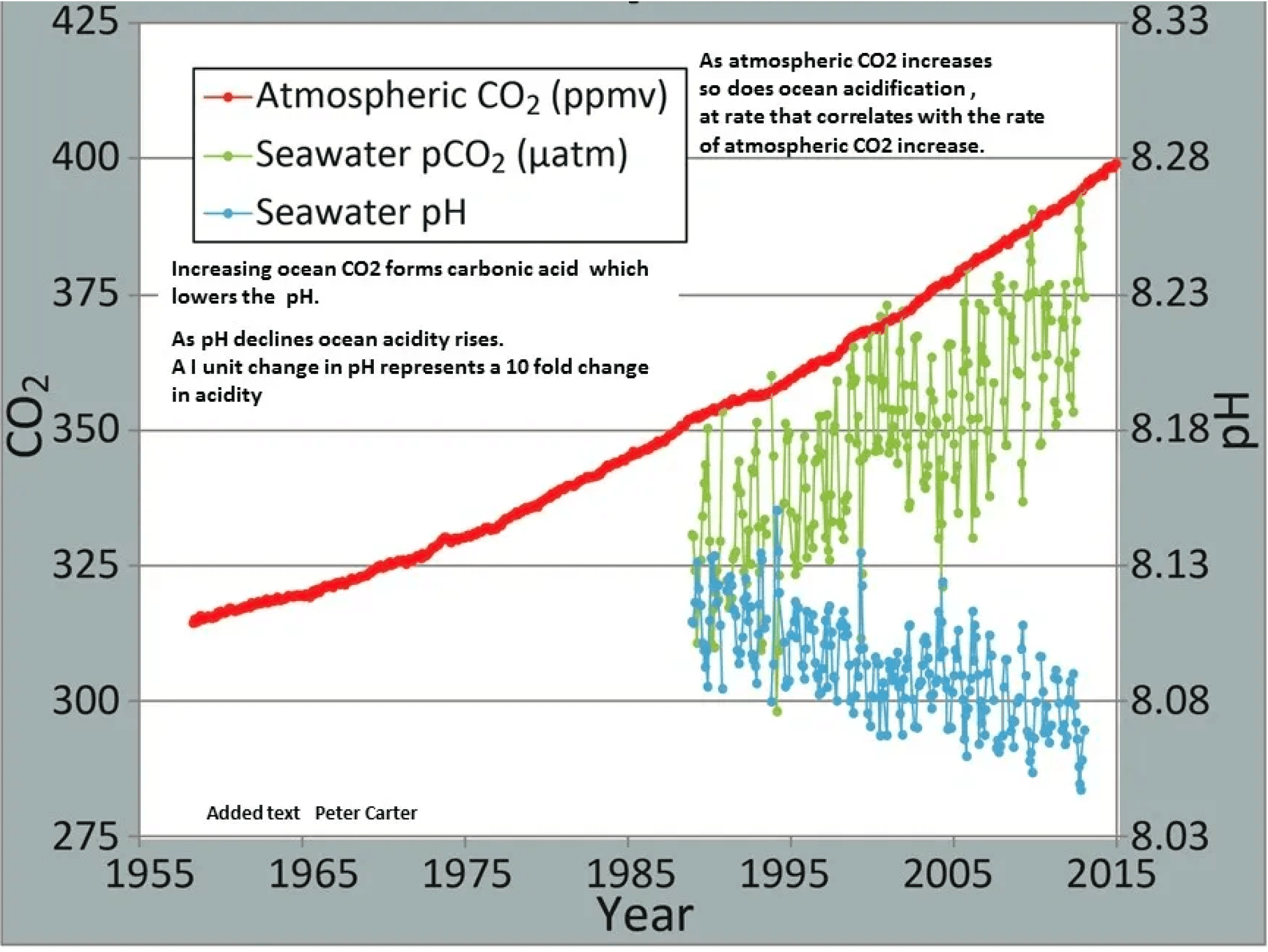 Ocean CO₂ and pH from NOAA: Correlation between rising levels of CO2 in the atmosphere at Mauna Loa with rising CO₂ levels in ocean at Station Aloha. As the CO₂ increases, the pH decreases; indicating increasing acidificication.